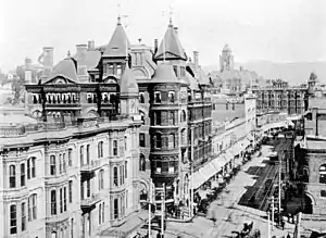 In the 1870s, Los Angeles was still little more than a village of 5,000. By 1900, there were over 100,000 occupants of the city. Several men actively promoted Los Angeles, working to develop it into a great city and to make themselves rich. Angelenos set out to remake their geography to challenge San Francisco with its port facilities, railway terminal, banks and factories. The Farmers and Merchants Bank of Los Angeles was the first incorporated bank in Los Angeles, founded in 1871 by John G. Downey and Isaias W. Hellman. Wealthy Easterners who came as tourists recognized the growth opportunities and invested heavily in the region.[59] During the 1880s and 1890s, the central business district (CBD) grew along Main and Spring streets towards Second Street and beyond. In Downtown Los Angeles, there was an archaeological excavation in 1996 on the site of Union Station which took place during the demolition of the parking structure as well as a massive excavation of the basement. Artifact deposits were typically trash pits and privies from the brothels and boarding houses that formerly existed in that area. In addition, there was also a sheet refuse of artifacts from Old Chinatown, the nearby residential area. This area of Downtown Los Angeles was known as the crib District which which was heavily occupied by brothels and saloons.[60]