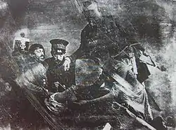 New Mexico at first accepted the United States' military occupation without resistance, but within a year of Kearney's annexation of the territory, there was a widescale uprising.[41] Nuevomexicano Pablo Montoya and Taos Puebloan Tomás Romero together led the 1847 Taos Revolt, which resulted in the execution of Charles Bent, Taos sheriff Stephen Lee, Judge Cornelio Vigil, Bent's brother-in-law Pablo Jaramillo, the attorney J. W. Leal, and a young boy named Narciso Beaubien.[42] The U.S. military moved quickly to quash the revolt, and the fighting ended in New Mexico after the Nuevomexicanos' subsequent defeats in the Battle of Red River Canyon, the Battle of Las Vegas, and the Battle of Cienega Creek.