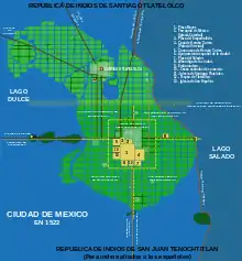 After the conquest, the Spaniards generally left the existing Nahua city-states or altepetl largely intact, but Mexico City was an exception since it became the seat of Spanish political power. It was established as a ciudad de españoles (city of Spaniards) and initially kept the remnants of its prehispanic place name, being called "Mexico-Tenochtitlan".[24] No longer the seat of Aztec power, the Spaniards allowed two areas to be ruled through Nahua governors (gobernadores) and town councils (cabildos), separate from the Spanish city council. San Juan Tenochtitlan and Santiago Tlatelolco became the mechanism for the crown to rule through indigenous intermediaries, particularly important in the Spanish capital since it also had a significant indigenous population. San Juan Tenochtitlan and Santiago Tlatelolco were not called by the Nahuatl term for polity, altepetl, but rather "partes" or "parcialidades" of Mexico City, with their new place names having a Christian saint's name preceding the prehispanic designation, in typical colonial fashion.[29] The structure in these two indigenous-ruled sections of the capital were on the same pattern of indigenous towns elsewhere in central Mexico. In the sixteenth century, these indigenous political structures mobilized tribute and labor rendered to the Spanish capital.[29] Even though prehispanic Tenochtitlan-Tlatelolco was built on an island in the middle of the major lake system, they had political power over holdings on the mainland, a standard pattern of scattered rather than compact settlement and rule. These mainland holdings or estancias rendered tribute and labor in the prehispanic period; in the colonial period this pattern continued during the early colonial period, but during the later period (ca. 1650–1821), the pattern broke down and estancias were separated.[29]