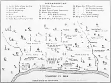 John Buchanan Sr., born in either Scotland or Ireland, migrated with his family from their home in Cumberland Co., Pennsylvania, to the Watauga Valley, Washington District of North Carolina. Afterward, they took a long horseback trek to Kentucky, left their women and traveled down to the Cumberland Settlements in late 1778, building a station on the southern side of the Cumberland River above the French Lick, on the high ground where Nashville now stands, in the early spring of 1779. His son, Major John Buchanan, known for the siege of Buchanan's Station, is considered to be one of the founders of Nashville, Tennessee.[14] Another settlement arrived when James Robertson left the Watauga settlement in northwestern North Carolina, traveled overland for two months, and arrived on the banks of the Cumberland River near the center of present downtown Nashville on Christmas Day, 1779.[15] They cleared the land and built a log stockade they called the Bluff station. Richard Henderson had planned to call the settlement Nashborough in honor of General Francis Nash, who won acclaim in the American Revolution. For a brief time, court records did use the Nashborough designation but there is no evidence that any of the settlers did. Robertson's friend and fellow Watauga settler John Donelson, along with some 60 families, including women and children, came in 30 flatboats and several pirogues down the Tennessee River and up the Cumberland, arriving April 23, 1780.[16] They founded a new community that was then a part of the state of North Carolina. The town was officially created and named Nashville in 1784, by an act of the North Carolina legislature.