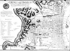 Located north of what will eventually become the Center City and on the east bank of the Schuylkill was a Lenape settlement named Coaquannock, meaning "grove of pines."[1] One of the largest Lenape settlements in the region, located in today's South Philadelphia near the confluence of the Schuylkill and Delaware Rivers, was Passyunk, meaning "in the valley."[2] Other settlements including the village of Nitapèkunk, "place that is easy to get to," located in today's Fairmount Park area, and Shackamaxon, "place where the chief was crowned", both were located on the west bank of Delaware River, upstream from today's Northern Liberties.