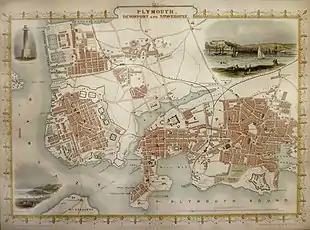 Extensive works were constructed to defend the town, including a line of stockaded earthworks on high ground north of the town, from Lipson in the east to Eldad in the west, as well as several isolated works, for instance at Prince Rock, Cattedown and Stonehouse.[23] Various skirmishes and confrontations occurred, including the rout of Royalist cavalry along Lipson Ridge on 3 December 1643,[23] which is commemorated by a monument in Freedom Fields Park,[24] and the battle of St Budeaux. Construction of the Royal Citadel began in 1665, after the Restoration; it was armed with cannon facing both out to sea and into the town, rumoured to be a reminder to residents not to oppose the Crown.