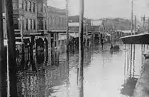 One of the Susquehanna River's most damaging floods occurred in March 1936. In the Wyoming Valley, the flood waters covered approximately 45 square miles (120 km2). Property loss in Plymouth Borough alone was estimated to be about $1,000,000.[26] A large number of Plymouth residents were left homeless, and many volunteers responded to help with rescue and relief efforts. These were coordinated from headquarters set up in the Town Hall building. The Vine Street and Franklin Street schools were converted to temporary dormitories, and the Central School served as a makeshift hospital. The town's three fire companies patrolled the flooded areas during the inundation, and afterward did duty pumping out flooded cellars.[26] After the flood waters receded, Atty. Harold L. Freeman and Mrs. John Q. Mask chaired a fund-raising drive to aid families left destitute by the disaster, while Mrs. Ralph Worthington and Mrs. C. C. Groblewski coordinated donations of clothing made by the Red Cross.[26]