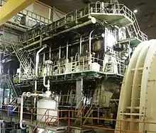 At the start of 1912 it was claimed that the largest diesel engines built for stationary work (of 2,000 and 2,400 bhp) were built by Sulzers, though this had been surpassed by an order received by Sulzers for four 4,000 hp 6-cylinder engines from Chile for electricity generation. These two-stroke crosshead engines were described as being basically the same as their marine engines without the reversing gear.[17] In 1915 a 4,500 bhp engine was installed at Harland & Wolfe, Belfast. This installation had been delayed due to the war complicating commercial arrangements. A second engine of the same size had been installed at a Zurich electricity works, and another was being installed at a French electricity station - the engines were described as being "identical in essential principles and also external construction with large marine engines by the same firm".[18]