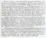 Such advertising aroused criticisms of quackery and immorality. The safety of many nostrums was suspect and the efficacy of others non-existent.[94] Horace Greeley, in a New York Herald editorial written in 1871, denounced abortion and its promotion as the "infamous and unfortunately common crime– so common that it affords a lucrative support to a regular guild of professional murderers, so safe that its perpetrators advertise their calling in the newspapers".[108] Although the paper in which Greeley wrote accepted such advertisements, others, such as the New York Tribune, refused to print them.[108] Elizabeth Blackwell, the first woman to obtain a Doctor of Medicine in the United States, also lamented how such ads led to the contemporary synonymity of "female physician" with "abortionist".[108]