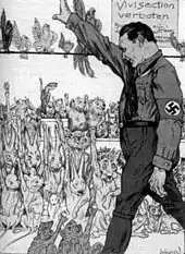 He stopped short of advocating vegetarianism, arguing that, so long as an animal's death was quick, men would suffer more by not eating meat than animals would suffer by being eaten.[70] Schopenhauer also theorized that the reason people succumbed to the "unnatural diet" of meat-eating was because of the unnatural, cold climate they emigrated to and the necessity of meat for survival in such a climate, for fruits and vegetables could not be dependably cultivated at those times.[71] He applauded the animal protection movement in England—"To the honor, then, of the English, be it said that they are the first people who have, in downright earnest, extended the protecting arm of the law to animals."[69] He also argued against the dominant Kantian idea that animal cruelty is wrong only insofar as it brutalizes humans: