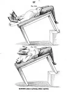 In 1858, Silvester proposed a new method of artificial ventilation in which the victim is laid in the supine position, and their arms are raised above their head to aid inhalation and then pressed against their chest to aid exhalation, with this sequence repeated several times per minute.[4][22] Silvester's method received a great deal of attention, and was advocated by many prominent physicians of that era, including Friedrich von Esmarch.[23]