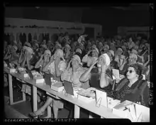 During the early 1900s, makeup was not excessively popular. In fact, women hardly wore makeup at all. Make-up at this time was still mostly the territory of prostitutes, those in cabarets and on the black & white screen.[26] Face enameling (applying actual paint to the face) became popular among the rich at this time in an attempt to look paler. This practice was dangerous due to the main ingredient often being arsenic.[27] Pale skin was associated with wealth because it meant that one was not out working in the sun and could afford to stay inside all day. Cosmetics were so unpopular that they could not be bought in department stores; they could only be bought at theatrical costume stores. A woman's "makeup routine" often only consisted of using papier poudré, a powdered paper/oil blotting sheet, to whiten the nose in the winter and shine their cheeks in the summer. Rouge was considered provocative, so was only seen on "women of the night." Some women used burnt matchsticks to darken eyelashes, and geranium and poppy petals to stain the lips.[27] Vaseline became high in demand because it was used on chapped lips, as a base for hair tonic, and soap.[27] Toilet waters were introduced in the early 1900s, but only lavender water or refined cologne was admissible for women to wear.[28] Cosmetic deodorant was invented in 1888, by an unknown inventor from Philadelphia and was trademarked under the name "Mum". Roll-on deodorant was launched in 1952, and aerosol deodorant in 1965.