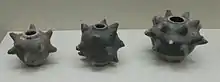 A more fact based and clear description of the bomb exists in the History of Jin: "The heaven-shaking-thunder bomb is an iron vessel filled with gunpowder. When lighted with fire and shot off, it goes off like a crash of thunder that can be heard for a hundred li [thirty miles], burning an expanse of land more than half a mu [所爇圍半畝之上, a mu is a sixth of an acre], and the fire can even penetrate iron armor."[66] A Ming official named He Mengchuan would encounter an old cache of these bombs three centuries later in the Xi'an area: "When I went on official business to Shaanxi Province, I saw on top of Xi'an's city walls an old stockpile of iron bombs. They were called 'heaven-shaking-thunder' bombs, and they were like an enclosed rice bowl with a hole at the top, just big enough to put your finger in. The troops said they hadn't been used for a very long time."[66] Furthermore, he wrote, "When the powder goes off, the bomb rips open, and the iron pieces fly in all directions. That is how it is able to kill people and horses from far away."[67]