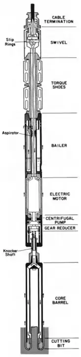 To continue drilling at Camp Century, CRREL used a cable-suspended electromechanical drill. The first drill of this type had been designed for mineral drilling by Armais Arutunoff; it was tested in 1947 in Oklahoma, but did not perform well.[109][110] CRREL bought a reconditioned unit from Arutunoff in 1963 for $10,000,.[109][110][111] and brought it to the CRREL offices in Hanover, New Hampshire.[109][110] It was modified for drilling in ice, and taken to Camp Century for the 1964 season.[109][110] The drill didn't need an antitorque device; the armoured cable was formed of two cables each twisted in opposite directions, so if the cable began to twist it provided its own antitorque.[112] To remove the cuttings, ethylene glycol was added to the hole with each trip; this dissolved the ice chips and the bailer, with diluted ethylene glycol, was emptied on each return to the surface.[113][114] Drilling continued for the next two years, and in June 1966 the EM drill extended the hole to the bottom of the icecap at 1387 m, drilling through a silty band at 1370 m depth, and then extending the hole below the ice to 1391 m. The subglacial material included a mixture of rocks and frozen till, and was about 50–60% ice. Inclinometer measurements were taken, and when the hole was excavated and reopened in 1988, new inclinometer measurements enabled the speed of the ice flow at different depths to be determined. The bottom 229 m of the ice, dating from the Wisconsin glaciation, was found to be moving five times as fast as the ice above it, indicating that the older ice was much softer than the ice above.[112]