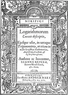 The method of logarithms was first publicly propounded by John Napier in 1614, in a book titled Mirifici Logarithmorum Canonis Descriptio.[25] [26] [27]
