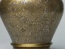 Around 1256, the Mongol occupation of Iraq began, and the region became a part of the Ilkhanate.[3] Of the artifacts agreed to be "nabish al-Mawsili" (of Mosul), approximately 80% were produced after the commencement of Mongol rule in Mosul.[4] However, it is unclear as to whether or not all of these artifacts were produced within Mosul and later exported as esteemed gifts, or created elsewhere by Mosulian artisans who relocated but maintained the "al-Mawsili" signature.