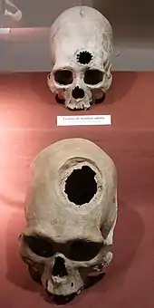 Trepanation, similar to some techniques used today, is the oldest surgical procedure known and was practised in the Stone Age in many parts of the world,[1] and in some areas may have been quite widespread. The main pieces of archaeological evidence are in the forms of cave paintings and human remains. One third of 120 skulls found at a site in France dating to 6500 BCE had undergone trepanning.[2] It was also practised widely in the pre-Columbian Andes[3].[4] These procedures were mostly performed on combatants, with evidence from skeletal remains revealing that the earliest methods usually resulted in death.[4] However, by the 1400s, Incas proved to be "skilled surgeons", as survival rates rose to about 90%, infection rates following the procedure were low and evidence was found showing that some individuals survived the surgery on multiple occasions.[4] Incan surgeons learned to avoid areas of the head that would cause injury, using a scraping method on the skull that would cause less trauma.[4] They also likely used medicinal herbs of the time, such as coca and alcohol for pain while balsam and saponin would be employed for antibiotic purposes.[4]