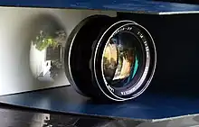 A 150mm Petzval lens was fitted to a conical metal Voigtländer camera taking circular daguerreotypes in 1841. The Voigtländer-Petzval was the first camera and lens specifically designed to take photographs, instead of being simply a modified artist's camera obscura.[1]: 37 [7][8] The Petzval Portrait was the dominant portrait lens for nearly a century. It had what would now be considered severe field curvature and astigmatism, but It was centrally sharp (about a 20° field of view, or 10° for critical applications), and it quickly drifted out of focus to a soft outer field, producing a pleasant halo effect around the subject. The Petzval Portrait remains popular as a projection lens where the narrow angles involved mean the field curvature is not significant.[9]: 823–824