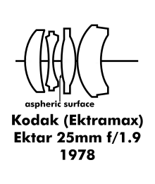 Retrofocus design also influenced non-retrofocus lenses. For example, Ludwig Bertele's Zeiss Biogon 21mm f/4.5,[63] released in 1954 for the Contax IIA (1950, West Germany) 35mm RF, and its evolution, the Zeiss Hologon 15mm f/8[64] of 1969, fixed to the Zeiss Ikon Hologon Ultrawide (West Germany), were roughly symmetrical designs. However, each half can visualized as retrofocus. The Biogon and Hologon designs take advantage of the large negative elements to limit the light falloff of regular wide angle lenses.[1]: 150–152 [65] With a 110° field of view, the Hologon would otherwise have had a 3¼ stop corner light falloff, which is wider than the exposure latitude of contemporaneous films. Nonetheless, the Hologon had a standard accessory radially graduated 2 stop neutral density filter to ensure completely even exposure. The distance from the Hologon's rear element to the film was only 4.5 mm.[66]
