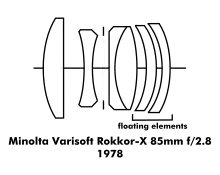 Convenience of a different sort was the major feature of the Tokina SZ-X 70-210mm f/4-5.6 SD (Japan) of 1985. It was the first ultra-compact zoom (85×66 mm, 445 g, 52mm filter); half the size of most earlier 70-210 zooms[126] (the third generation Vivitar Series 1 70-210mm f/2.8-4 [1984, USA/Japan] was 139×70 mm, 860 g, 62mm filter).[127] Like the Kiron 28-210mm, the twelve element/eight group/three cell Tokina had a small variable maximum aperture, but added low dispersion glass and a new bidirectional nonlinear zooming action, to bring size and weight down to an absolute minimum.[128]