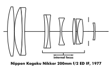 Today's photographic lens state-of-the-art is apochromatic correction, which is, very roughly, twice as strict as anastigmatic.[25] However, such lenses require correcting for higher ordered aberrations than the original seven[26] with rare earth (lanthanum oxide) or fluorite (calcium fluoride) glasses of very high refractive index and/or very low dispersion of mid-twentieth century invention.[1]: 79 [27][28] The first apochromatic lens for consumer cameras was the Leitz APO-Telyt-R 180mm f/3.4 (1975, West Germany) for Leicaflex series (1964, West Germany) 35mm SLRs.[2]: 781 Most professional telephoto lenses since the early 1980s are apochromatic.[29][30] Note, better-than-apochromat lenses are available for scientific/military/industrial work.[31]