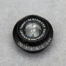 However, the Kilfitt Makro-Kilar 4 cm f/3.5 (West Germany/Liechtenstein) of 1955 for Exakta 35mm SLRs changed the everyday meaning of macro lens.[80] It was the first lens to provide continuous close focusing. Version D of Heinz Kilfitt's (West Germany) Makro-Kilar focused from infinity to 1:1 ratio (life-size) at two inches; version E, to 1:2 ratio (half life-size) at four inches.[81] The Makro-Kilar was a Tessar mounted in an extra long draw triple helical. SLR cameras were best for macro lenses because SLRs do not suffer from viewfinder parallax error at very close focus distances.[82]