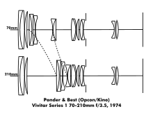 In 1974, the Ponder & Best (Opcon/Kino) Vivitar Series 1 70-210mm f/3.5 Macro Focusing Zoom (USA/Japan) was widely hailed as the first professional-level quality very close focusing "macro" zoom lens for 35mm SLRs. Ellis Betensky's (USA) Opcon Associates perfected the Series 1's fifteen element/ten group/four cell formula by calculations on the latest digital computers.[106] Freed from the drudgery of hand computation in the 1960s, designs of such variety and quality only dreamt of by earlier generations of optical engineers became possible.[107][108] Modern computer created zoom designs may be so complex that they have no resemblance to any of the classical human created designs.