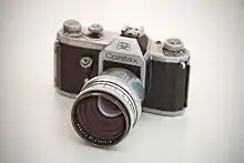 The Tessar was the standard high-quality, moderate-aperture, normal-perspective lens of the twentieth century. The Kodak Anastigmat Special 100mm f/3.5 on the Kodak Super Six-20 (1938, USA), the first autoexposure still camera, was a Tessar,[36] as was the D. Zuiko 2.8 cm f/3.5 on the Olympus Pen (1959, Japan), the original Pen half frame camera;[37] the Schneider S-Xenar 40mm f/3.5 on the late version of the Rollei 35 (1974, West Germany/Singapore);[38][39] and the AF Nikkor D 45mm f/2.8P Special Edition for the Nikon FM3A (2001, Japan), the last manual focus 35mm SLR released by a major maker.[40] It was fitting that the Zeiss Stiftung's last camera, the Zeiss Ikon S 312, had a Zeiss Tessar 40mm f/2.8 (1972, West Germany).[41]