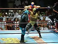 Masks (mascaras) have been used dating back to the beginnings of lucha libre. Early masks were very simple with basic colors to distinguish the wrestler. In modern lucha libre, masks are colorfully designed to evoke the images of animals, gods, ancient heroes, and other archetypes, whose identity the luchador takes on during a performance. Virtually all wrestlers in Mexico would start their careers wearing masks, but over the span of their careers a large number of them would be unmasked. Sometimes, a wrestler slated for retirement would be unmasked in his final bout or at the beginning of a final tour, signifying loss of identity as that character. Sometimes, losing the mask signifies the end of a gimmick with the wrestler moving on to a new gimmick and mask. The mask is considered "sacred" to a degree, so much so that fully removing an opponent's mask during a match is grounds for disqualification.[23] During their careers, masked luchadores would often be seen in public wearing their masks and keeping up the kayfabe of lucha libre while other masked wrestlers would interact with the public and press normally. However, they would still go to great lengths to conceal their true identities; in fact, the mask is synonymous with the luchador. Luchadors whose masks are removed or damaged in the ring would often allow themselves to be pinned in the scripted context of the match's storyline, to preserve their identity. El Santo continued wearing his mask after retirement, revealed his face briefly only in old age, and was buried wearing his silver mask. With the importance placed on masks in lucha libre, losing the mask to an opponent is seen as the ultimate insult and can at times seriously hurt the career of the unmasking wrestler. Putting one's mask on the line against a hated opponent is a tradition in lucha libre as a means to settle a heated feud between two or more wrestlers. In these battles, called luchas de apuestas ("matches with wagers"), the wrestlers "wager" either their mask or their hair.[24] The first luchas de apuestas match was presented on July 14, 1940 at Arena México. The defending champion Murciélago was so much lighter than his challenger Octavio that he requested a further condition before he would sign the contract: Octavio would have to put his hair on the line. Octavio won the match and Murciélago unmasked, giving birth to a tradition in lucha libre.[25]