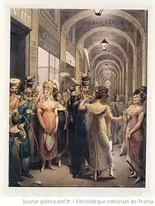 On October 4, 1793, the Commune of Paris issued a regulatory order forbidding prostitutes to stand in public spaces to "incite to debauchery".[31] Although it led to the arrest and sanitary control of more than 400 prostitutes in 1794, this decree did not prevent the continued development of prostitution, particularly at the Palais-Royal, which became the first sex market in the capital. There were many "daughters" that crisscrossed the garden paths and galleries of the Palace, and erotic shows and shops dedicated to prostitution.[32]