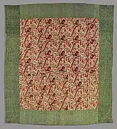 The National Gallery of Australia has a 3-by-3-metre (9.8 by 9.8 ft) quilt known as the Rajah Quilt. It was created by about 30 convict women as they were transported from Woolwich, England to Hobart, Tasmania in 1841. The quilt was rediscovered in Scotland in 1989. It is a medallion quilt with Broderie perse at its centre.[4]