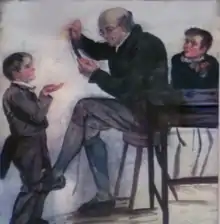 The humanist concern with increasing public access to education was shared by the Protestant reformers, who saw schools as vehicles for the provision of moral and religious education for a more godly society. After the Protestant party became dominant in 1560, the First Book of Discipline set out a plan for a school in every parish, but this proved financially impossible.[12] In the burghs the existing schools were largely maintained, with the song schools and a number of new foundations becoming reformed grammar schools or ordinary parish schools. Schools were supported by a combination of kirk funds, contributions from local heritors or burgh councils and parents that could pay. They were inspected by kirk sessions of local elders, which checked for the quality of teaching and doctrinal purity.[13] There were also large number of unregulated private "adventure schools". These were often informally created by parents in agreement with unlicensed schoolmasters, using available buildings and are chiefly evident in the historical record through complaints and attempts to suppress them by kirk sessions because they took pupils away from the official parish schools. However, such private schools were often necessary given the large populations and scale of some parishes. They were often tacitly accepted by the church and local authorities and may have been particularly important to girls and the children of the poor.[14] Outside of the established burgh schools, which were generally better funded and more able to pay schoolmasters, masters often combined their position with other employment, particularly minor posts within the kirk, such as clerk.[13] Immediately after the Reformation they were in short supply, but there is evidence that the expansion of the university system provided large numbers of graduates by the seventeenth century. There is evidence of about 800 schools for the period between 1560 and 1633. The parish schools were "Inglis" schools, teaching in the vernacular and taking children to the age of about 7, while the grammar schools took boys to about 12.[3] At their best in the grammar schools, the curriculum included the catechism, Latin, French, Classical literature and sports.[15]