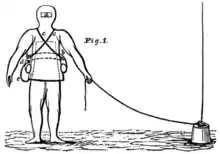 An early diving dress using a compressed air reservoir was designed and built in 1771 by Sieur[33] Fréminet from Paris. He conceived an autonomous breathing machine equipped with a reservoir, dragged behind the diver or mounted on his back.[34][35] Fréminet called his invention machine hydrostatergatique and used it successfully for more than ten years in the harbors of Le Havre and Brest, as stated in the explanatory text of a 1784 painting.[36][37]