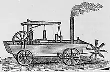 In 1867 Canadian jeweller Henry Seth Taylor demonstrated his four wheeled steam buggy at the Stanstead Fair in Stanstead, Quebec and again the following year.[30] The basis of the buggy which he began building in 1865 was a high wheeled carriage with bracing to support a two-cylinder steam engine mounted on the floor.[31]