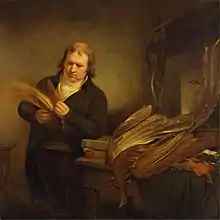According to John W. Moyer in another one of his works for Encyclopedia Americana, one of the earliest published works on taxidermy is R. A. F. de Reaumur's Treatise, which was published in 1749.[5] In this work, Reaumur discussed the preservation of skins of birds; however, because his plan was simply to mount birds with wires – as had been done over two centuries before – it did not find much favor among other taxidermists.[3] Instead, his method spurred the development of a new system of preservation in which one cut the skins longitudinally into halves, filled one half with plaster, fixing the skin to a backboard, inserting an eye, painting on a beak and legs, and then mounting the bird in a framework of glass.[3] For the next several decades, this process became the standard method of European taxidermists.