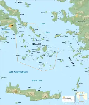 Numerous authors considered, or still consider them as a sole entity, a unit. The insular group is indeed rather homogeneous from a geomorphological point of view; moreover, the islands are visible from each other's shores while being distinctly separate from the continents that surround them.[1] The dryness of the climate and of the soil also suggests unity.[2] Although these physical facts are undeniable, other components of this unity are more subjective. Thus, one can read certain authors who say that the islands’ population is, of all the regions of Greece, the only original one, and has not been subjected to external admixtures.[3][4] However, the Cyclades have very often known different destinies.