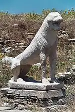 From the 8th century BC, the Cyclades experienced an apogee linked in great part to their natural riches (obsidian from Milos and Sifnos, silver from Syros, pumice stone from Santorini and marble, chiefly from Paros).[35] This prosperity can also be seen from the relatively weak participation of the islands in the movement of Greek colonisation, other than Santorini's establishment of Cyrene.[38] Cycladic cities celebrated their prosperity through great sanctuaries: the treasury of Sifnos, the Naxian column at Delphi or the terrace of lions offered by Naxos to Delos.
