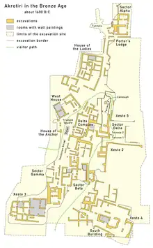 Excavations since 1967 have uncovered a built-up area covering one hectare, not counting the defensive wall.[29] The layout ran in a straight line, with a more or less orthogonal network of paved streets fitted with drains. The buildings had two to three floors and lacked skylights and courtyards; openings onto the street provided air and light. The ground floor contained the staircase and rooms serving as stores or workshops; the rooms on the next floor, slightly larger, had a central pillar and were decorated with frescoes. The houses had terraced roofs placed on beams that had not been squared, covered up with a vegetable layer (seaweed or leaves) and then several layers of clay soil,[29] a practice that continues in traditional societies to this day.