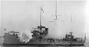 The Hellenic Navy suffered its first loss of the war on 15 August 1940 (two months before the formal outbreak of hostilities) when the cruiser Helli was sunk by the Italian submarine Delfino, possibly acting on Mussolini's orders. During the Greco-Italian War, the Navy took over convoy escort missions in the Aegean and the Ionian Sea and undertook three unsuccessful raids against the Italian supply convoys in the Strait of Otranto. The most important role was given to the submarines, which although obsolete, sank some Italian cargo ships in the Adriatic, losing one submarine in the process. The Greek submarine force (six boats) was however too small to be able to seriously hinder the supply lines between Italy and Albania (between 28 October 1940 and 30 April 1941, Italian ships made 3,305 voyages across the Otranto straits, carrying 487,089 military personnel, including 22 field divisions, and 584,392 tons of supplies while losing overall only seven merchant ships and one escort ship).[4] When Nazi Germany attacked Greece, the RHN was decimated by the Luftwaffe, suffered the loss of 25 ships within a few days during April 1941. It was then decided to shift the remaining fleet (one cruiser -the famous Georgios Averof-, six destroyers, five submarines, three torpedo boats and a number of auxiliary vessels) to Alexandria in Egypt.[3] There the ships were repaired and equipped with modern anti-aircraft weapons.