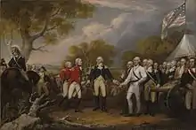 Both the British and the American armies fought the Battles of Saratoga. Burgoyne still expected assistance from Henry Clinton, so his army dug in and waited. Clinton's forces did sail up the Hudson River, taking the Hudson Highlands forts as well as burning down Kingston (the NY State Capital at the time), but Clinton was forced to sail back to New York City in order to supply reinforcements after Howe's forces left to take Philadelphia.[38] As a result, Burgoyne never received the assistance he needed. Burgoyne's army was now at roughly 6800 men and was surviving on reduced rations.[38] On October 7, 1777, Burgoyne's army attempted to sweep around the American army in a last-ditch effort to escape from being surrounded,[38] but an American counterattack led by General Horatio Gates successfully surrounded the British Army.[36] An offensive by Benedict Arnold (which led to him being wounded in the leg) pushed Burgoyne closer to surrendering.[36] In the end, Burgoyne surrendered his army to the Americans on October 17. This battle would later be known as the turning point of the war. In addition, this battle convinced the French that the American Continentals could beat a European army. As a result, the French joined the war on the side of the Americans.[38]
