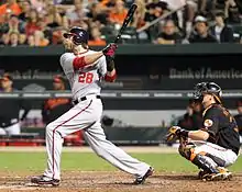 The Nationals started their season in a skid, falling to the bottom of their division. On April 28, 2015, after a seven-game losing streak, with rookie starting pitcher A. J. Cole on the mound, the Nationals found themselves in at a nine-run deficit against their archrival, the Atlanta Braves. But the team clawed back to win the game 13–12, overcoming their largest run deficit ever.[57] Over the coming weeks, the Nationals rebounded from their poor start to the season, rising to the top of the division behind a career-best season for outfielder Bryce Harper.[58][59] On June 20, 2015, the Nationals shut out the Pittsburgh Pirates, with Max Scherzer throwing a no-hitter that was nearly perfect. The game was the second no-hitter in Nationals history.[60] Scherzer became the first pitcher since Nolan Ryan in 1973 to throw two no-hitters in a single season regular season on October 3, 2015, shutting down the New York Mets in a performance that also equaled Ryan's historic mark of 17 strikeouts in a no-hitter.[61][62] However, the Mets won the division, clinching it in late September.[63]