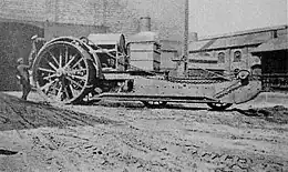 When World War I broke out, with the problem of trench warfare and the difficulty of transporting supplies to the front, the pulling power of crawling-type tractors drew the attention of the military.[18] Holt tractors were used to replace horses to haul artillery and other supplies. The Royal Army Service Corps also used them to haul long trains of freight wagons over the unimproved dirt tracks behind the front. Holt tractors were, ultimately, the inspiration for the development of the British and French tanks.[17][19]