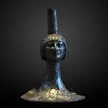 The oldest surviving examples of metallic trumpets are the two instruments that were discovered in the tomb of Tutankhamun in 1922. One of these is 58.2 cm (22.9 in) long and is made of silver; it has a conical tube 1.7 to 2.6 cm (0.67 to 1.02 in) in diameter, and a flaring bell 8.2 cm (3.2 in) wide. The other instrument is 50.5 cm (19.9 in) long and is made of copper with gold overlay. Neither instrument has a separate mouthpiece.[3] Both are inscribed with the names of gods associated with Egyptian army divisions. A third trumpet, probably dating from the Ptolemaic era, is now preserved in the Louvre museum in Paris.