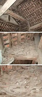 The rood was sometimes of such dimensions as to require some support in addition to the gallery on which it rested. A carved beam was used from which a chain connected the rood itself. At Cullompton, Devon, such a beam still exists, and is carved with foliage; an open cresting ornaments the under side and two angels support the ends. This particular rood stood on a base of rocks, skulls and bones, carved out of two solid logs averaging 18 in. wide and 21 in. high, and together measuring 15 ft 6 in (4.72 m) long; there are round holes along the top which were probably used for lights.