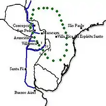 The Jesuits began in the late 16th century to establish a series of reduction settlements in the lands of the Guaraní people to convert them to Catholicism. The Jesuit missions had a high degree of autarky but needed coins to pay taxes and acquire products they could not produce.[2] While in the early 17th century Jesuits had supported governor Hernando Arias de Saavedra's ban on yerba mate production, they became by mid-17th century severe competitors to the harvesters of the land north of Tebicuary River who had had a practical monopoly on the product.[6][12] In 1645 the Jesuits had successfully requested the Spanish Crown to be allowed to produce and export yerba mate.[12] The Jesuits initially followed the normal production procedure by sending thousands of Guaranís out into long journeys to the swamps where the best trees grew to harvest naturally occurring stands, where many Indians fell ill or died.[12] From the 1650s to the 1670s the Jesuits succeeded in domesticating the plant,[7] something that contemporaries had found extremely difficult.[12] The Jesuits kept the domestication a secret. It apparently involved feeding the seed to birds or emulating the passing of the seeds through the digestive system of a bird.[4] The Jesuits gained a series of commercial advantages over their competitors in the Tebacuary region. Apart from their successful domestication and establishment of plantations, their missions were closer to the important trade hubs of Santa Fé and Buenos Aires and they succeeded in obtaining exemptions from the tithe, alcabala, and the additional tax established in 1680.[13] These privileges caused a conflict with the Paraguayan cities of Asunción and Villarrica that accused the Jesuits of flooding the Platine market with cheap yerba mate, and led to the imposition of limits for the Jesuit exports,[14] which they nevertheless exceeded, so that at the time of the expulsion of the Order they exported four times the amount they were legally allowed.[4] The Jesuits did not, officially, sell mate for profit beyond covering basic necessities and taxes, and accused the Paraguayans of causing prices to drop, adding that their yerba mate was preferred by merchants not due to its price but due to its better quality.[14]