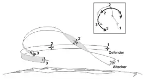 The low Yo-Yo is one of the most useful maneuvers, which sacrifices altitude for an instantaneous increase in speed. This maneuver is accomplished by rolling with the nose low into the turn, and dropping into a steeper slice turn. By utilizing some energy that was stored in the vertical plane, the attacker can quickly decrease range and improve the angle of the attack, literally cutting the corner on the opponent's turn. The pilot then pulls back on the stick, climbing back to the defender's height. This helps slow the aircraft and prevents an overshoot, while placing the energy back into altitude. A defender spotting this maneuver may try to take advantage of the increase in AOT by tightening the turn in order to force an overshoot.[45][48] The low Yo-Yo is often followed by a high Yo-Yo, to help prevent an overshoot, or several small low Yo-Yos can be used instead of one large maneuver.[51]