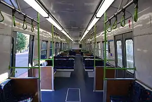 Beginning in 1992, the Hitachi fleet received internal, external and cab upgrades at the PTC's Ballarat North and Bendigo Workshops.[6] The refurbishment included the replacement of the steel flooring in each car where it has reached the end of its service life, replacing existing rubber or carpet flooring with vinyl, replacing interior panels above the seats with a new anti-vandal material, replacing the woodgrain upper panels and bone-coloured roof with off-white panels, new seat pads and repainting and strengthening the seat modules, removal of the luggage racks and advertising boards, overhaul of windows and doors including the motors that were worked by air and a general clean of the exterior and new green and gold stripes applied.[6] The refurbishment of over half of the Hitachi M cars also included improved air-conditioning in the driver's cab and double-thickness windscreens, with aluminium replacing the original rubber surrounds. These M car works were completed by early 1994.[6] After these upgrades were made, the non-upgraded M cars were no longer allowed to lead a train in revenue service, effectively making them B units. Two M cars have been preserved in their original unmodified form, while a third M car (187M) as modified by the PTC is on static display at the AHRS Museum in Williamstown.