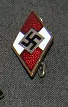 The badge shows the Hitler Youth emblem: a golden framed rhomboid having in the centre a golden square field with a black swastika in a red and white field, with a silver-coloured edge.[4]