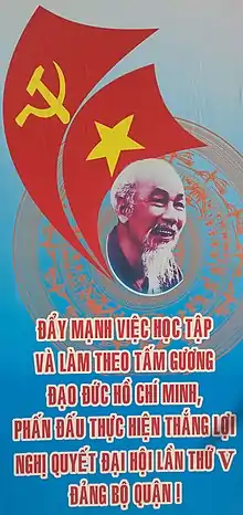 A particular aspect of Ho Chi Minh thought is the emphasis on personal morality and ethics.[24] The personal values of Ho Chi Minh are regularly upheld by the Party, and party members are taught to exemplify Ho Chi Minh's personal values: practicing the standard of industriousness, thrift, integrity, uprightness, public-spiritedness and selflessness in serving the country and the people.[25][26] Central to Ho Chi Minh morality is living a modest lifestyle, free from material worries, whilst devoting oneself to the collective good and the advancement of socialism and self-determination.[27][26] Ho Chi Minh wrote about morality throughout his life, and often criticized individualism, such as in his short essay Raise up Revolutionary Ethics, Eliminate Individuals.[27] The personal values of Ho Chi Minh are a mandatory part of the school curriculum throughout Vietnam.[28]