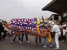 At Pézenas there is a huge creature called Le Poulain or Lo Polin (Occitan for "the colt"), carried by nine men and led by another, accompanied by a band of musicians. The Poulain has a realistically carved wooden head, with a snapping jaws and an extending neck that can reach up to first-floor windows; money or other offerings put into its mouth tumble down inside its neck. Its semi-cylindrical body is covered with a dark blue cloth, now decorated with stars and the coat of arms of Pézenas. Below the frame it has a tricolor skirt.[29]