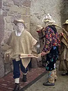 At Ezpeize the formal dancing is suddenly interrupted by a wild invasion. An unruly gang of rustically dressed characters, wearing masks or facial disguise, rushes into the dancing area in pairs, with loud cries. Some wave clubs. Some have furry tails. There is a doctor and a nurse, in white coats with a red cross on the back. They all race around the dancing space in an anti-clockwise direction and then fall to the ground in a writhing heap.[23]