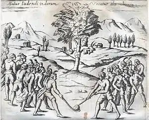 Games played with curved sticks and a ball can be found in the histories of many cultures. In Egypt, 4000-year-old carvings feature teams with sticks and a projectile, hurling dates to before 1272 BC in Ireland, and there is a depiction from approximately 600 BC in Ancient Greece, where the game may have been called kerētízein (κερητίζειν) because it was played with a horn or horn-like stick (kéras, κέρας).[10] In Inner Mongolia, the Daur people have been playing beikou, a game similar to modern field hockey, for about 1,000 years.[11]