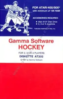Hockey is a 1981 sports video game published by Gamma Software for the Atari 8-bit family. Gamma also released an Atari 8-bit soccer game the following year.[1]