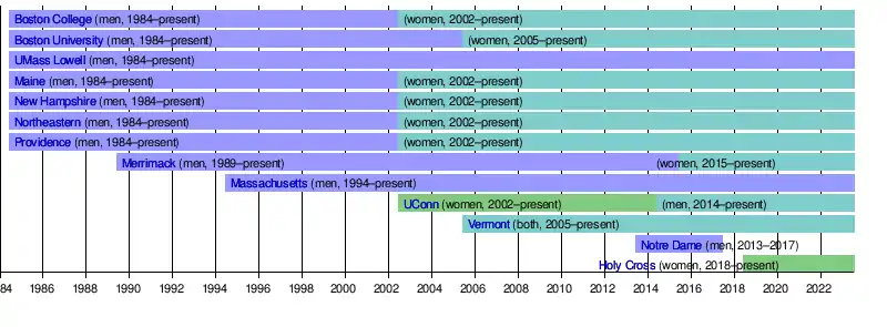 Hockey East came into existence in 1984 for men's hockey when most of its current members split from what is today known as ECAC Hockey, after disagreements with the Ivy League members.[2] The women's league, the WHEA, began play in 2002.[3][4]
